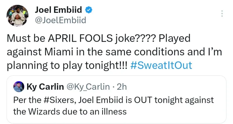 虎扑04月01日讯 据美媒Clutch Points报道,费城76人队中锋乔尔-恩比德在社交媒体上对有关他将缺席今晚对阵奇才比赛的报道做出了强烈回应。